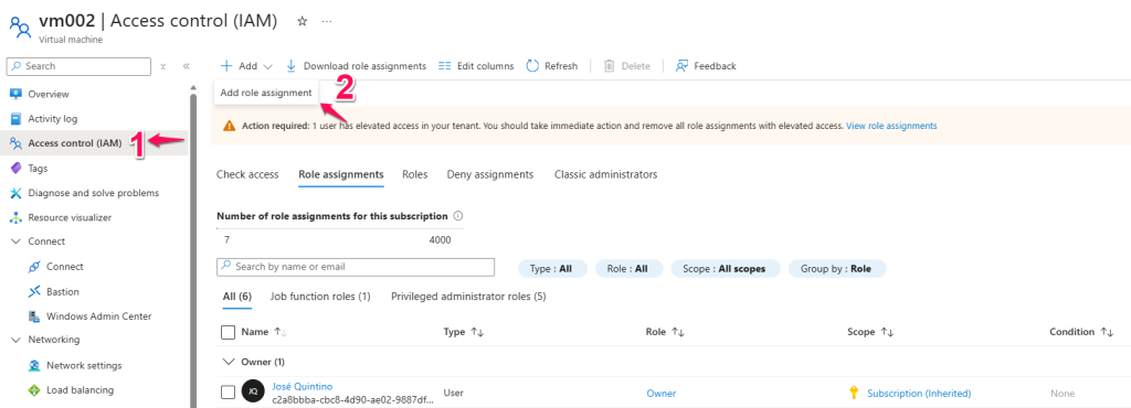 5- Clique em controle de acesso (IAM), selecione adicionar atribuição de função, escolha a função adequada (ex: backep reader) e atribua a vm.